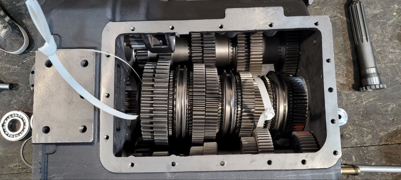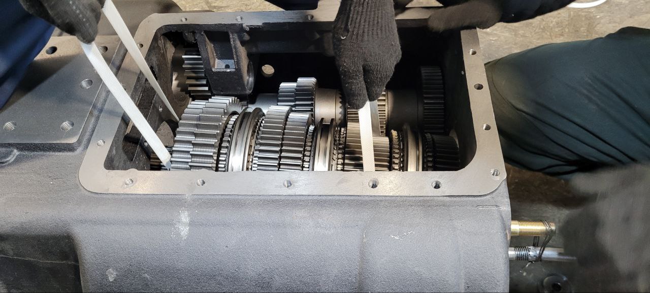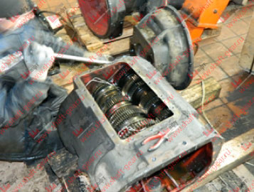 - Разбор основной коробки передач начинается со снятия шестерни ведущей демультипликатора и опоры подшипника. После отсоединяется стопорное кольцо, которое находится в шестерне заднего хода. Шестерня задней передачи по скользящей муфте снимается с зацепления со вспомогательных шестерней задней передачи. Съёмником отделяем подшипник промежуточного вала задней основной КПП и снимаем промежуточную шестерню задней передачи.