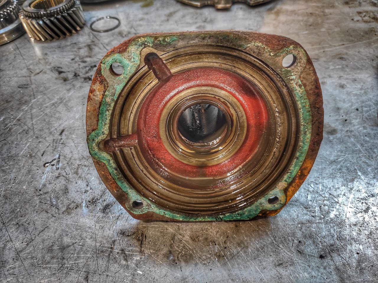 10. Когда у нас собран первичный вал, мы достаем подшипник с опорой, который центрует заднюю часть вторичного вала для установки шестерни заднего хода на ее посадочное место.