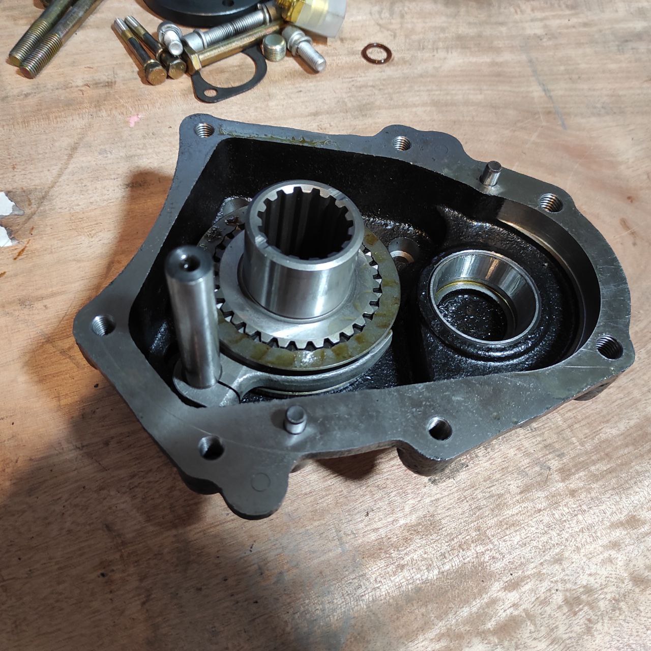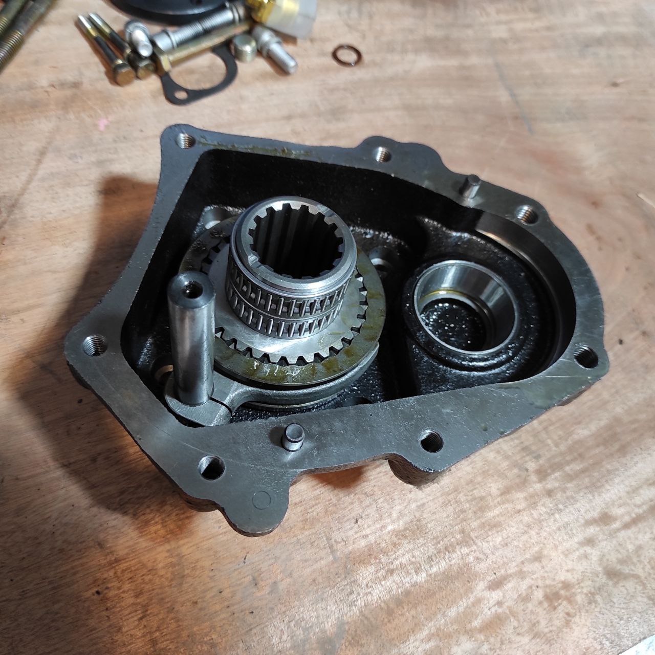 - На синхронизатор монтируем вилку демультипликатора, а заднюю крышку кладем на заготовленный механизм.