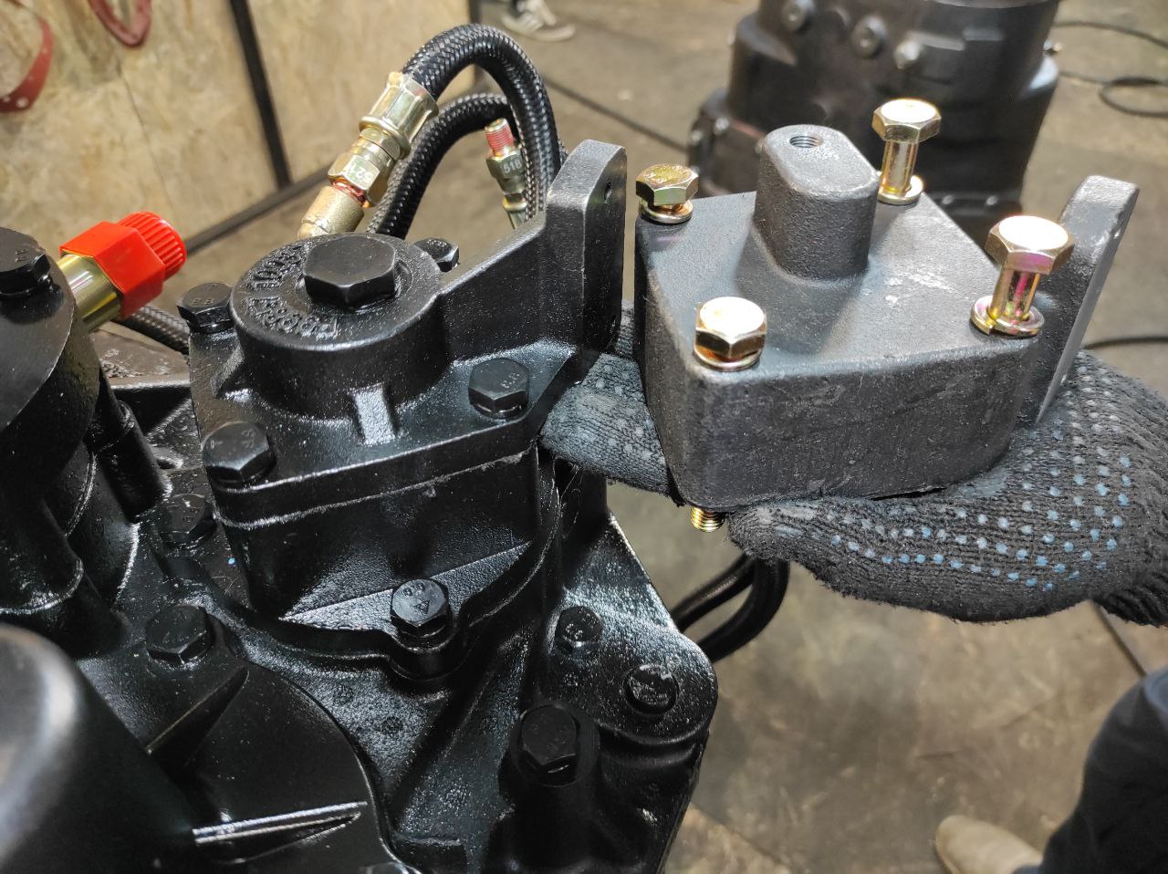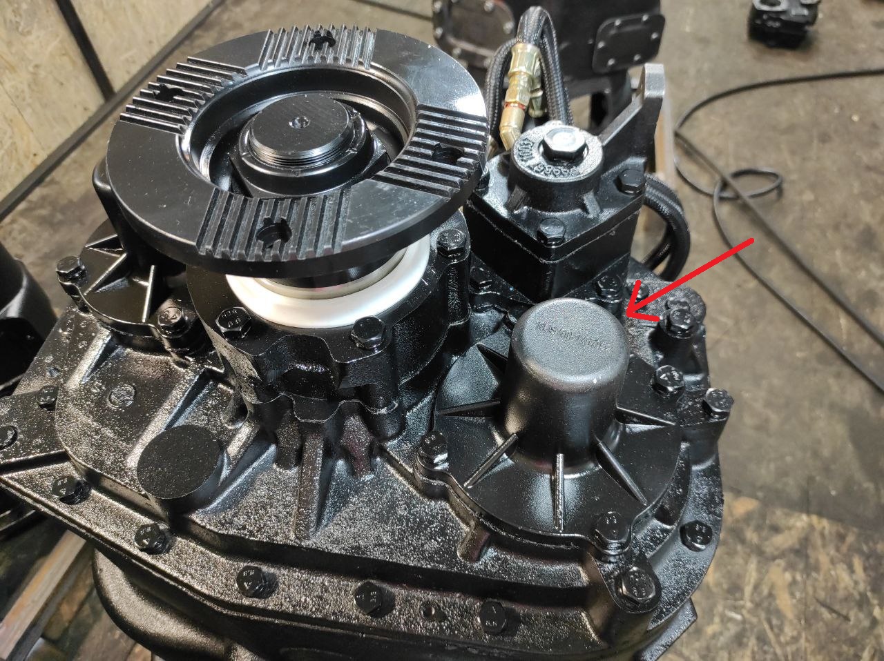 - После этого устанавливаем пневмоцилиндр и прикручиваем к валу вилку демультипликатора. На промежуточные валы надеваем крышки. Привод спидометра собираем на выходном вале и прикручиваем крышку спидометра. Фланец с пыльником монтируем на выходной вал и затягиваем гайку.