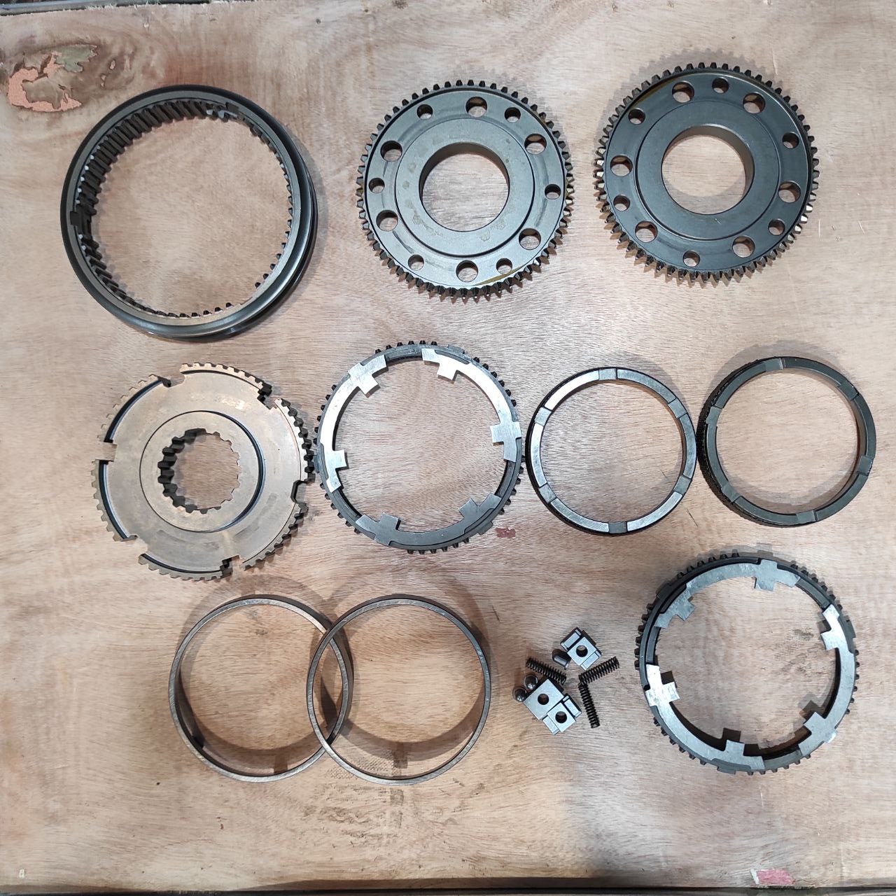 Синхронизатор демультипликатора состоит из трёх основных частей и пружинок, которые закрывают его. Два верхних кольца являются тормозами синхронизатора повышенной и пониженной передачи. В нижней части рисунка можно увидеть центральную часть синхронизатора, так называемую муфту синхронизации.