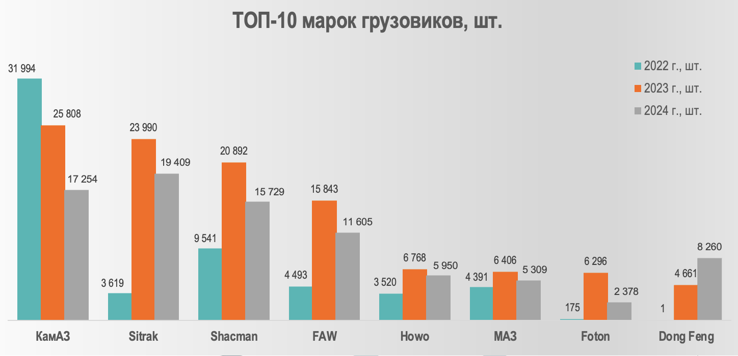 Если рассматривать рынок коммерческого транспорта и запчастей на них, ранее, наибольшую долю занимали европейские бренды. В начале 2022 года, продажи китайской техники – самосвалов и тягачей, значительно возросли, в результате ухода европейский брендов с отечественного рынка. Ввоз китайских грузовиков увеличился в 4 раза, согласно данным Федеральной таможенной службы за 2023 год. Импорт составил 86 531 единиц. В 2024 году импорт китайских грузовиков составил 119 500 единиц.
