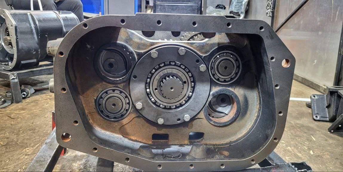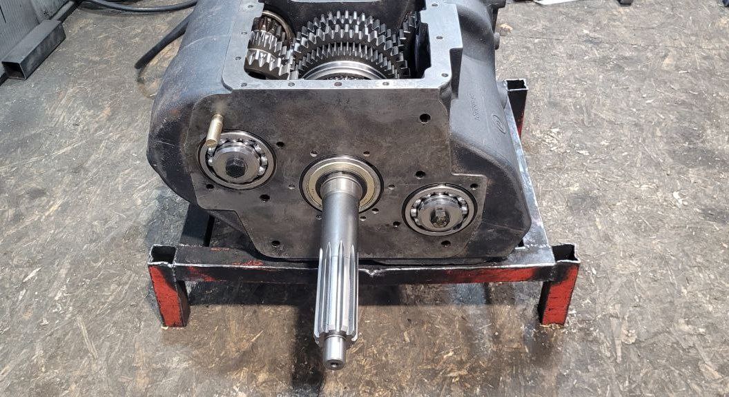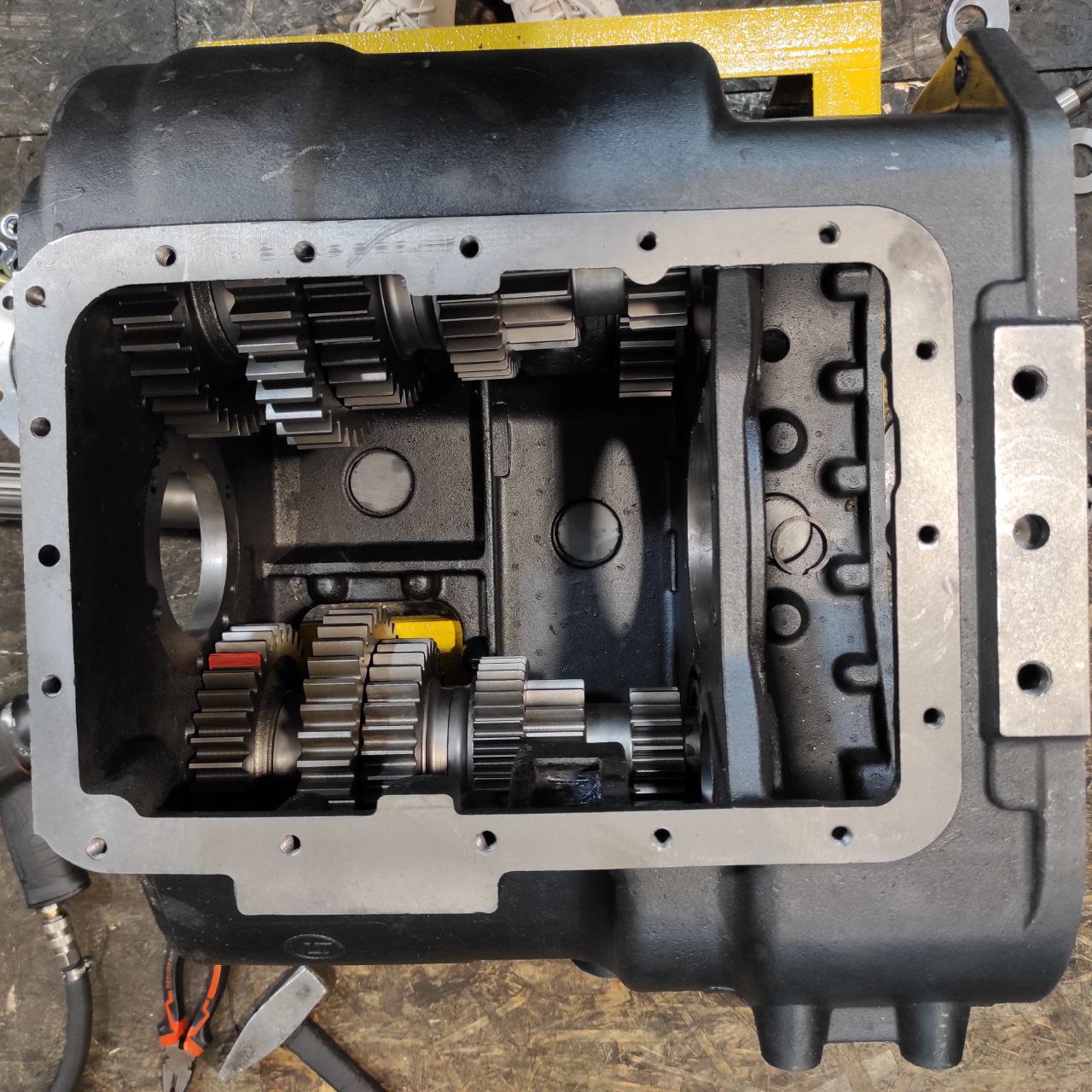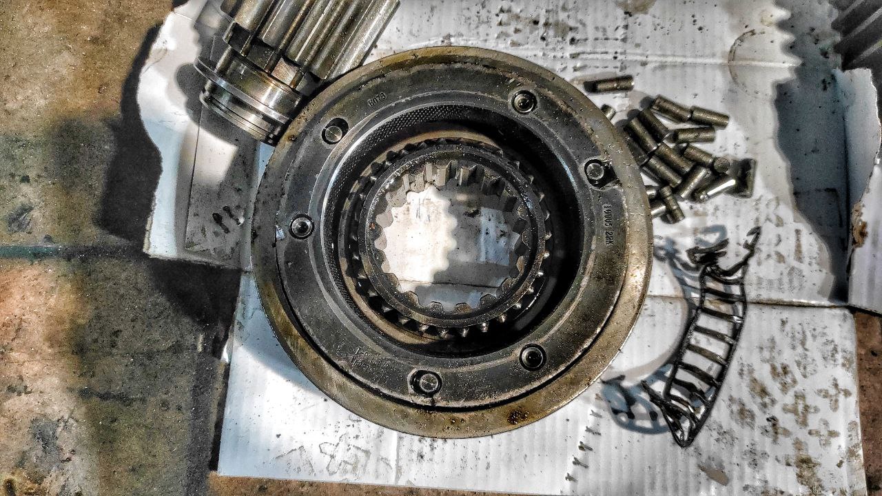 - Разбор основной коробки передач начинается со снятия шестерни ведущей демультипликатора и опоры подшипника. После отсоединяется стопорное кольцо, которое находится в шестерне заднего хода. Шестерня задней передачи по скользящей муфте снимается с зацепления со вспомогательных шестерней задней передачи. Съёмником отделяем подшипник промежуточного вала задней основной КПП и снимаем промежуточную шестерню задней передачи.