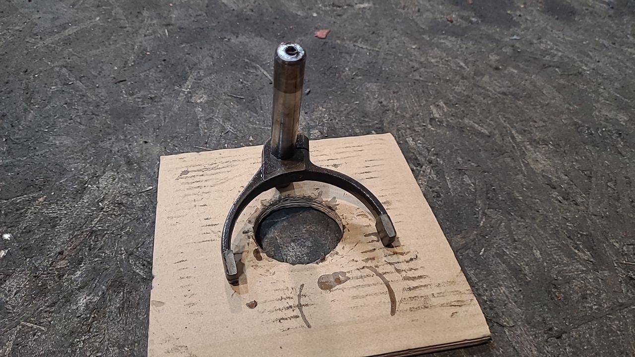 - Первое, что нужно сделать — разметить шестерню пониженной передачи. Для удобства под синхронизатор демультипликатора подкладываем брусок, чтобы в дальнейшем установить промежуточные валы. Синхронизатор помещаем так, чтобы тормоз пониженной передачи находился вверху. Выходной вал вставляем в посадочное место синхронизатора.