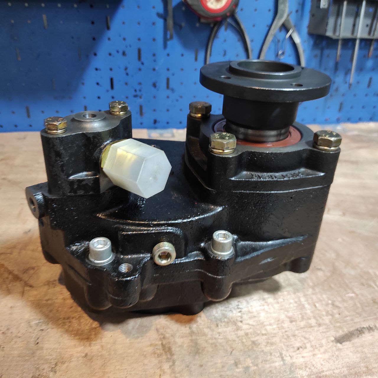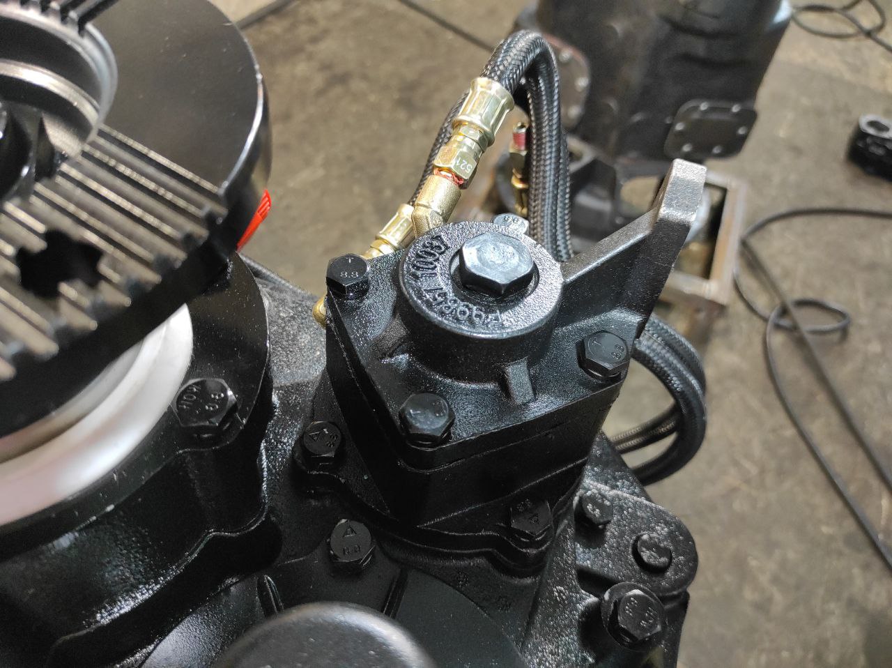 - После этого устанавливаем пневмоцилиндр и прикручиваем к валу вилку демультипликатора. На промежуточные валы надеваем крышки. Привод спидометра собираем на выходном вале и прикручиваем крышку спидометра. Фланец с пыльником монтируем на выходной вал и затягиваем гайку.